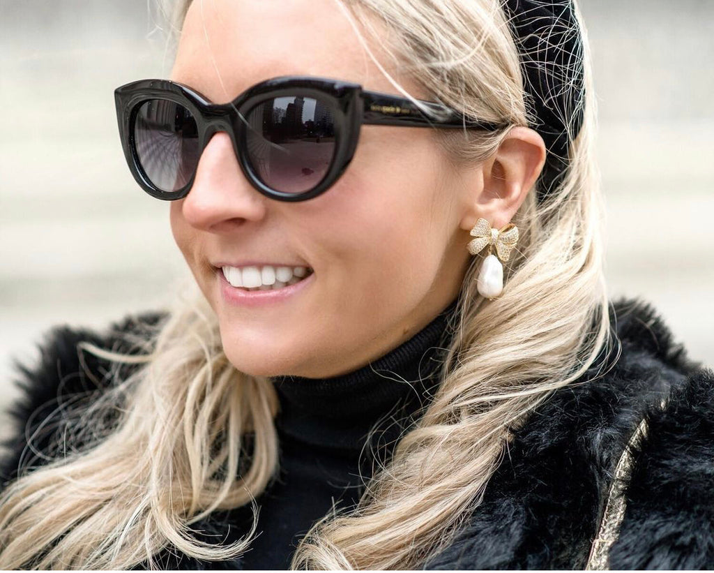 Beautiful pave cubic zirconias in a bow-shaped post, with a high-quality, freshwater baroque pearl.